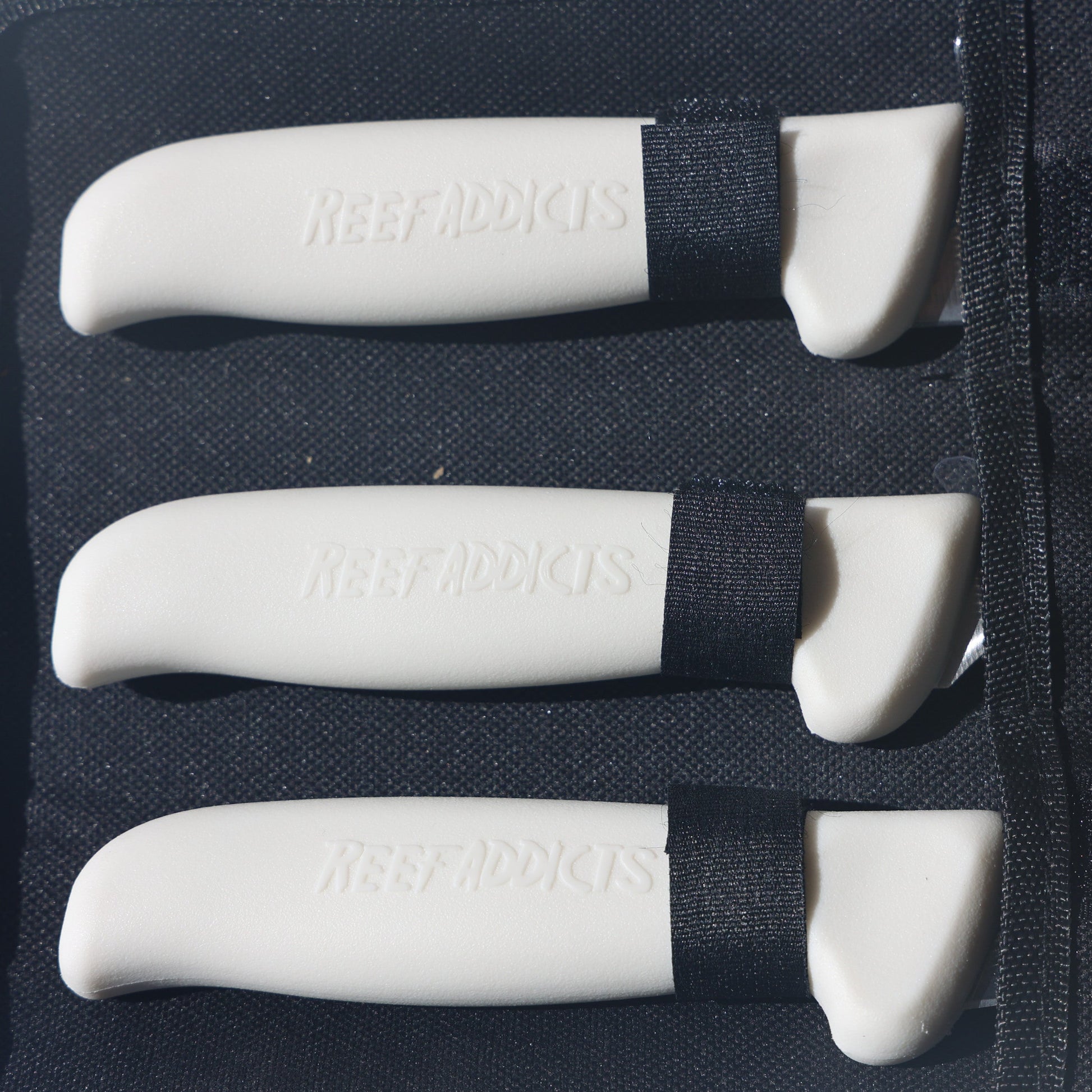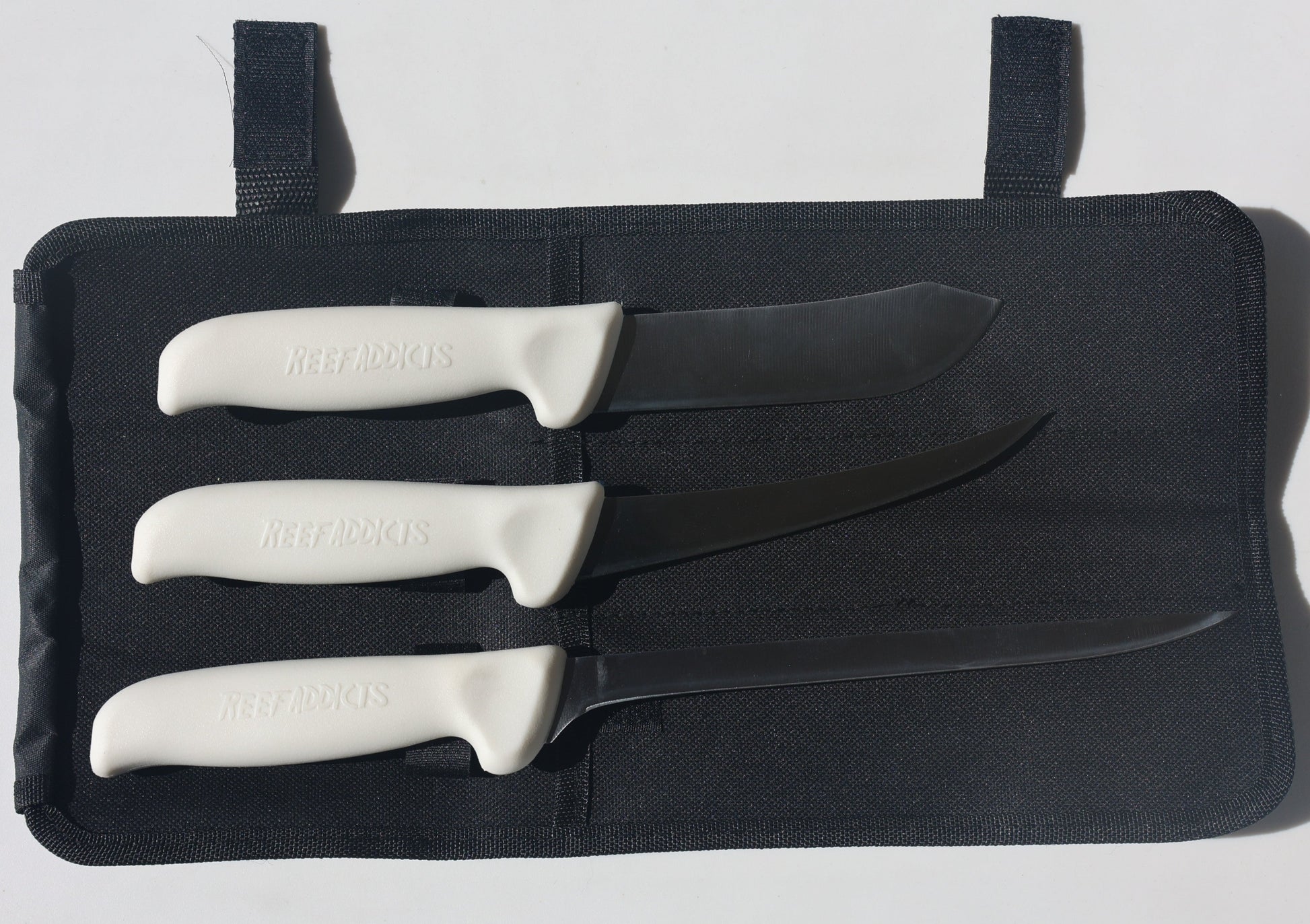 This 3-piece knife set include a Utility Fishing Knife for heavy-duty tasks, a Classic Fillet Knife for smooth, clean cuts, and a Flex Fillet Knife for precision skinning and deboning. Designed with a non-slip white handles and corrosion resistant blades.